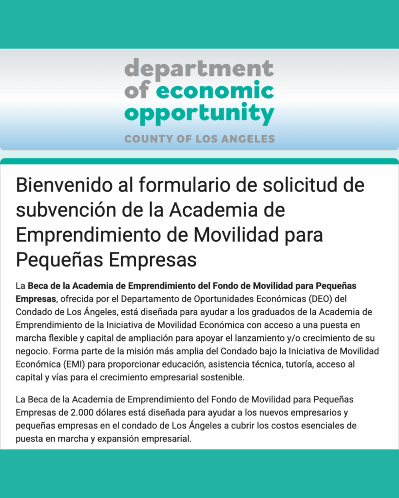 La Beca de la Academia de Emprendimiento del Fondo de Movilidad para Pequeñas Empresas, ofrecida por el Departamento de Oportunidades Económicas (DEO) del Condado de Los Ángeles, está diseñada para ayudar a los graduados de la Academia de Emprendimiento de la Iniciativa de Movilidad Económica con acceso a una puesta en marcha flexible y capital de ampliación para apoyar el lanzamiento y/o crecimiento de su negocio. Forma parte de la misión más amplia del Condado bajo la Iniciativa de Movilidad Económica (EMI) para proporcionar educación, asistencia técnica, tutoría, acceso al capital y vías para el crecimiento empresarial sostenible.